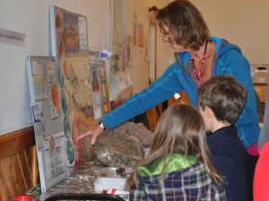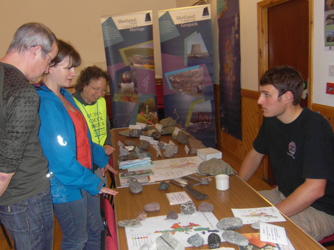 The event built on the success of the Volcano Fun Days in Edinburgh and provided activities for little kids and big kids alike. Impressive displays and a huge variety of samples gave visitors the chance to get hands-on with Shetland’s rocks and minerals, and a selection from further afield courtesy of Diana Turner. Dr Beverly Bergman demonstrated how to build a volcano and explode it, and how to model a caldera collapse using flour, balloons and just a splash of glitter! Recent geology graduates Will Moreland and Chris Lofthouse introduced visitors to Shetland’s geological development through maps and specimens and helped youngsters to get creative through geo-art. Those exhausted with all this activity could recruit their strength by making a chocolate world and eating it (!) before enjoying a ‘Lakes and Lava’ walk on Braewick Beach led by Jonathan Swale of Scottish Natural Heritage or exploring a section of Shetland’s volcano along the beautiful Eshaness coast.